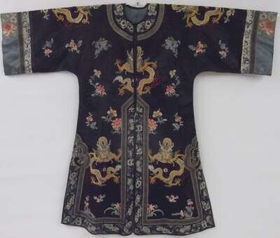 Silk embroidered robe with dragon design and roundals.