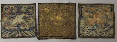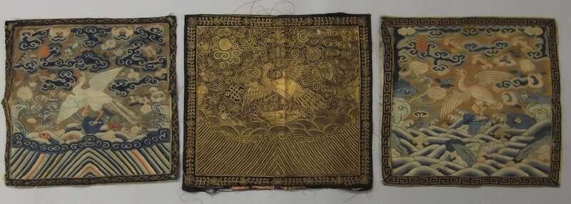 Two color embroidered and one metal thread embroidered silver pheasant badges.