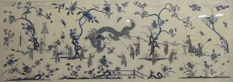 Embroidered in varying shades of blue with dragons, peaches, and figures in a garden landscape, framed.