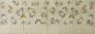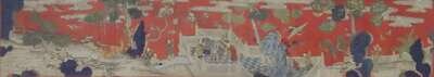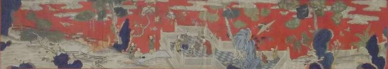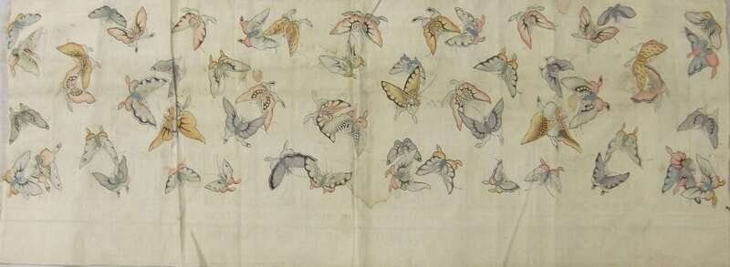 Long panel depicting figures and animals in a landscape setting flying kites playing musical instruments, against red ground, together with a butterfly kesi panel.