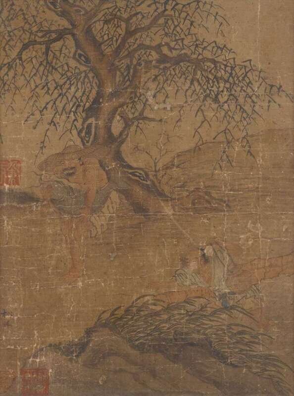 Ink and color on silk, signed Song Nian and three collector seals Xu Dongshi, , depicting fisherman catching fish by a riverbank, W: 8 3/4 inchesH: 11 1/2 inches;