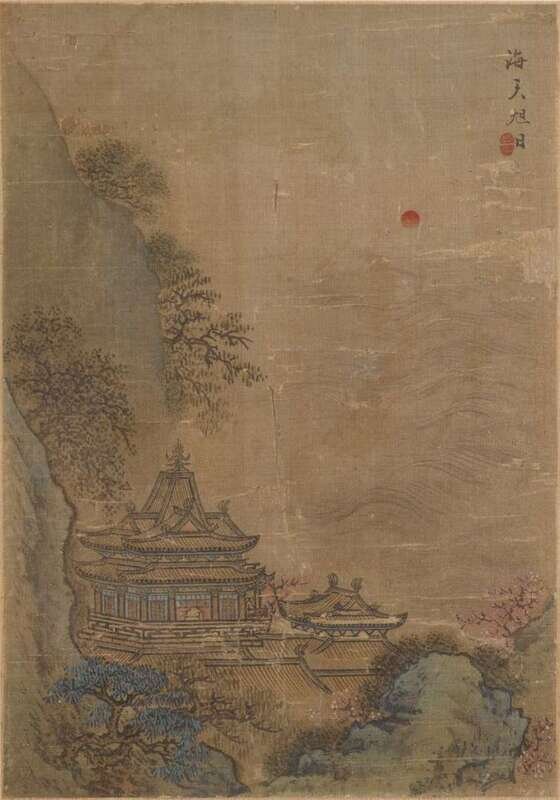 Ink and color on brocade, depicting pavillion seascape and the rising sun, entitled Hai Tian Xu Ri with two artist seals, H: 11 1/2 x W: 8 inches