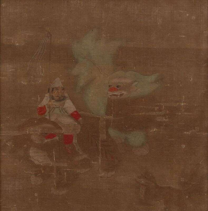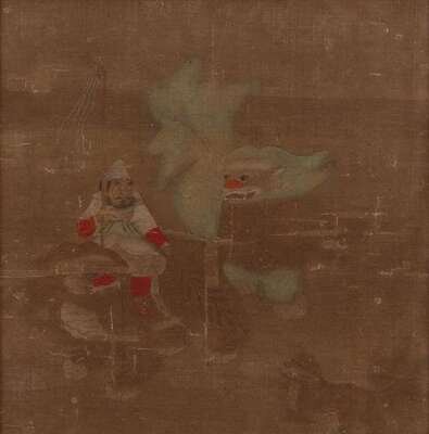 Ink and color on brocade, possibly depicting Zhongkui on Qilin, H: 10 x W: 9 3/4 inches