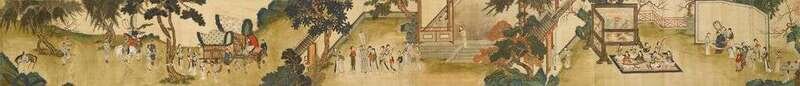 Handscroll, ink and color on brochade, signed Qiu Ying. Tianlaige, Molinwenwan, Xiangzijing, Shizhou and other collector seals. L: 100 in.