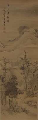 Hanging scroll, ink on paper, signed "song chuang ju shi Pu Quan" and artist seal mark "Pu Quan chang shou"; painting depicts a farmer with hoe walking homeward in a forest mountain landscape after a day of hard work. Sight H: 39 inches x W: 12 1/2 inches.
