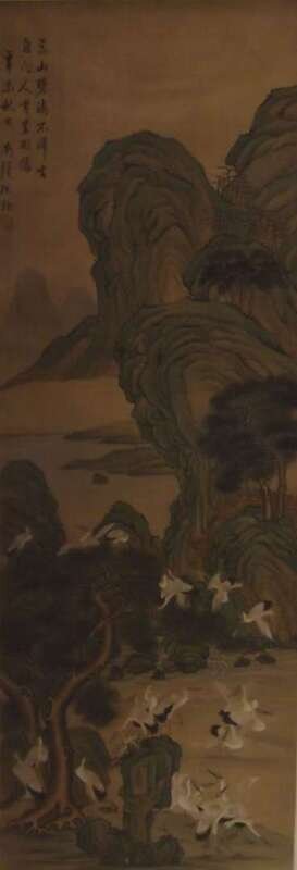Hanging scroll ink and color on brocade, H: 48 x W: 17 inches