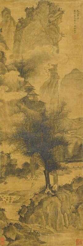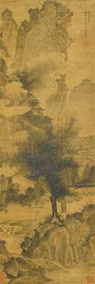 Hanging scroll, ink on silk, painted in Yuan style, signed: Jin Xi Wu Hong, sealed: Yuan Du and with two collector seals; sight H: 53 1/4 inches x W: 17 inches