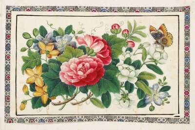 Gauche on paper, showing species of fish, botanicals and 19th century scenes, hard folio.
