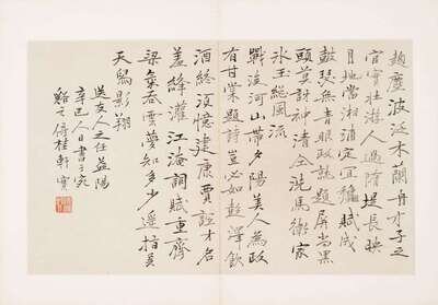 Seven-character poem in running-standard script, artist signed:Shi, sealed: Heng Bing Ye Ren, dedicated to friend Ren Yiyang. W: 17 1/2 x H: 11 inches