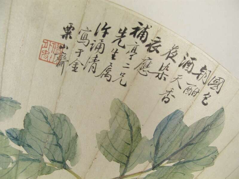 Colors on paper fan leaf, composed at Jin Su Shan Zhai, inscribed and artist signed Xu Song Qing, sealed Xiu Shan Wai Shi; L: 21 H: 9 1/2 inches