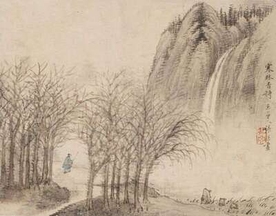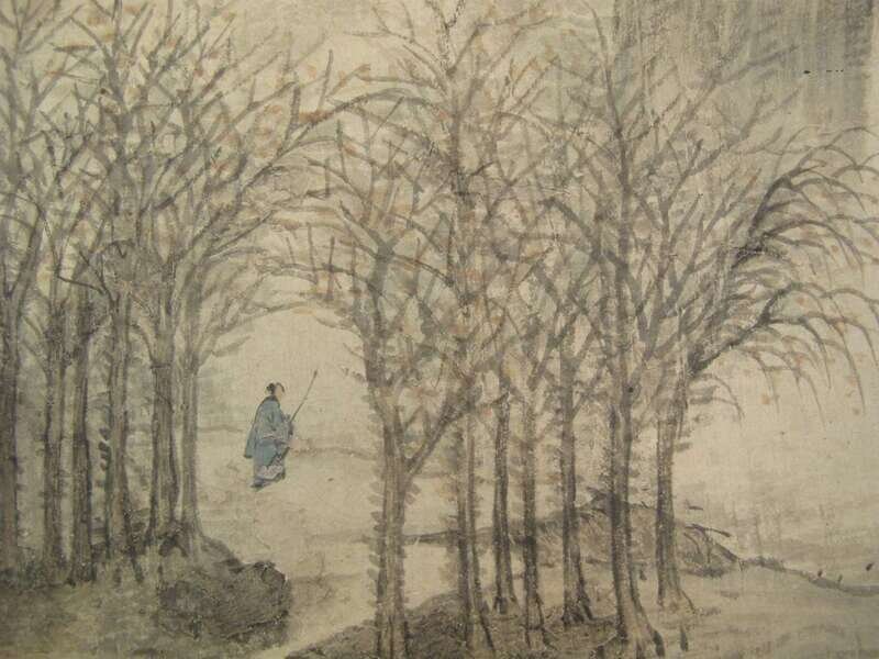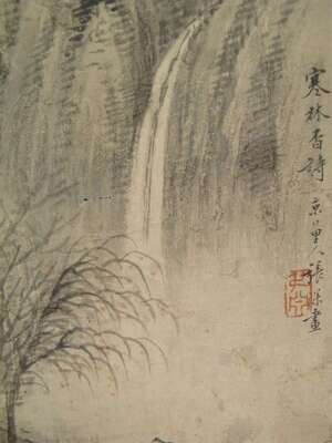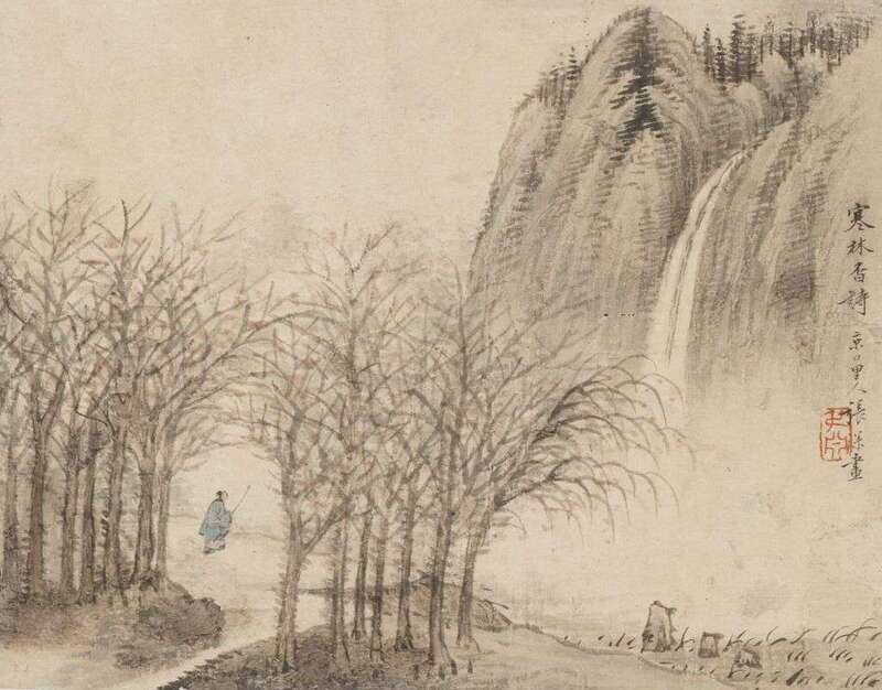 Ink and color on paper, titled Han Lin Xiang Shi, artist signed Zhang Shen sealed Shu Yuan, H: 7 1/4 W: 8 3/4 inches