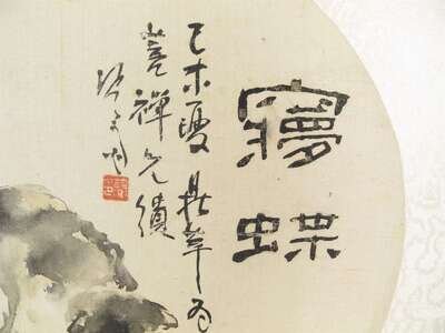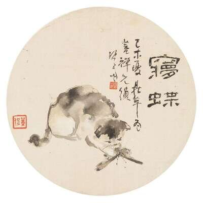Circular fan painting, ink on silk, entitled "Meng Die", inscribed, signed and with two artist sealmarks Jian Yin and Huang Jian; D: 8 1/4 inches