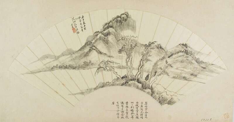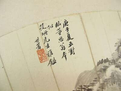 Fan painting, ink on paper, after Dong Qichang, signed Shi Fang, sealed Ruo Xi, W: 20 1/4, H: 9 1/2 inches