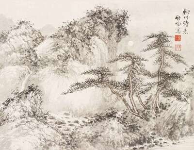 Album leaf, ink and wash on paper, artist signed:Qi Gong Xie, sealed: Qi and Yuan Bai; H: 8 3/4 x W 11 inches