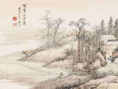 Album leaf, ink and colors on paper, titled Mo Jie Shiyi, signed Qi Gong, Sealed Qi and Yuan Bai