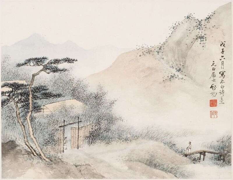 Album leaf, ink and colors on paper, artist signed Yuan Bai Ju Shi Qi Gong, sealed Qi and Yuan Bai, H 8 3/4 x W 11 inches.