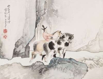 Album leaf, ink and color on paper, artist signed: Song Cuang Ju Shi Pu Quan, sealed: Pu Quan Chang Shou and Song Chuang.
