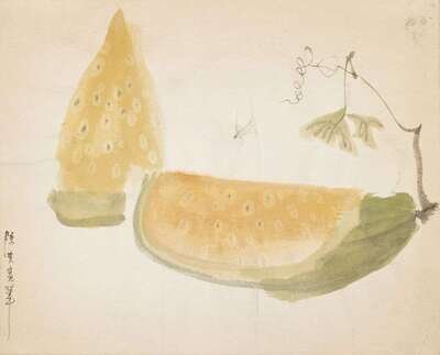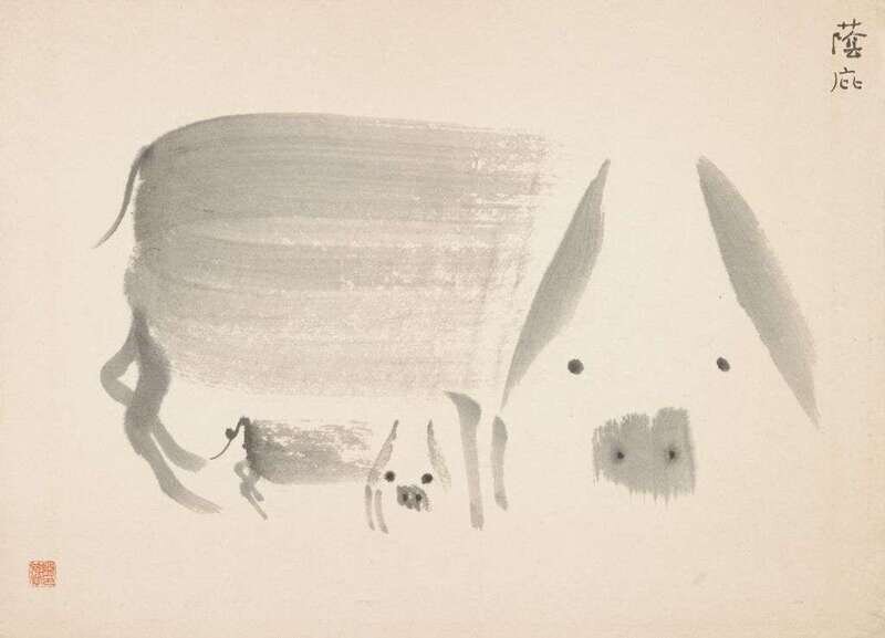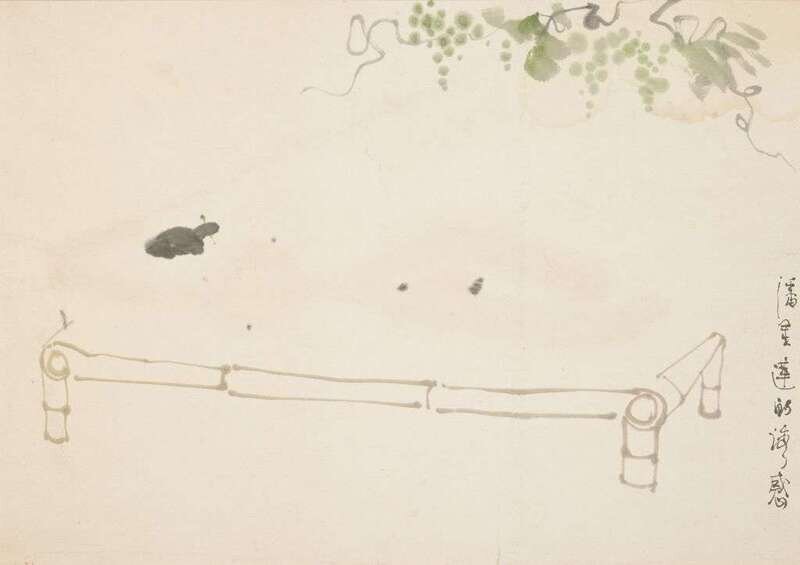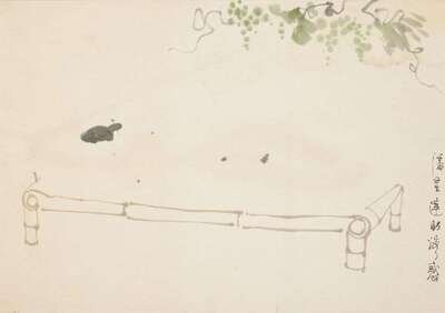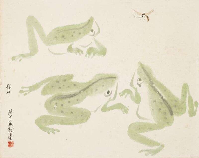 One depicting a female nude on a bamboo bedframe below grape vines, entitled the seduction of Pan Jinlian, framed in black matting, image size H: 9 7/8 x W: 13 1/2 inches; one depicting watermelon slices artist signed Chen Qi Kuan Bi, H: 9 1/2 x W: 11 1/4 inches; one depicting frogs entitled "ning shen" or concentration, artist signed "Chen Qikuan Xi Tu" and sealed, H 9 3/4 x 12 1/4 inches; one depicting sow and piglet entitled "under cover", artist sealed: Chen Qi Kuan Yin, H: 9 1/4 x W: 12 1/2 inches (4).