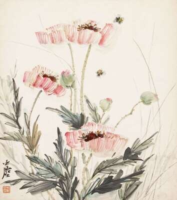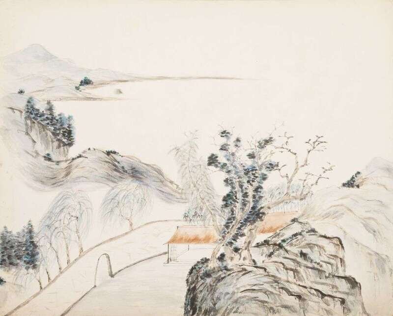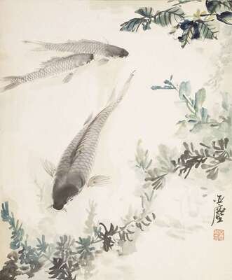 Four signed album leaves, ink and colors on paper cards, each signed Ya Chen and sealed Wang Ya Chen, two depicting carps and two blossoms, two unsigned artworks one on card and one on paper depicting landscape; largest image size H: 16 3/4 x W 14 1/4 inches.(6)