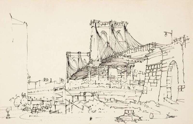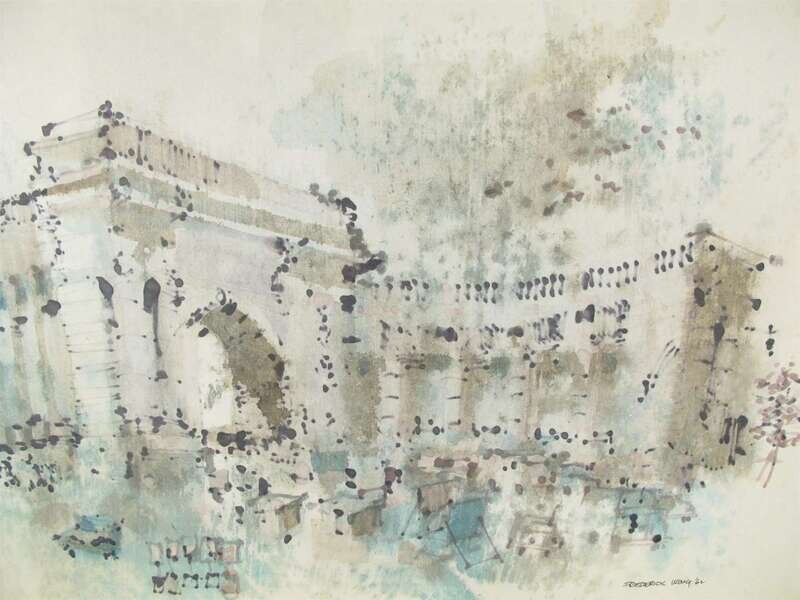 including a depiction of a triumphal arch, watercolor on paper, signed Huang Jingyu and Frederick Wong, with one artist sealmark Huang Jingyu, image size H: 20 1/4 W: 26 1/4 inches; and an ink drawing of a cable-stayed bridge signed Wong, 20 1/2 x 13 1/2 inches.