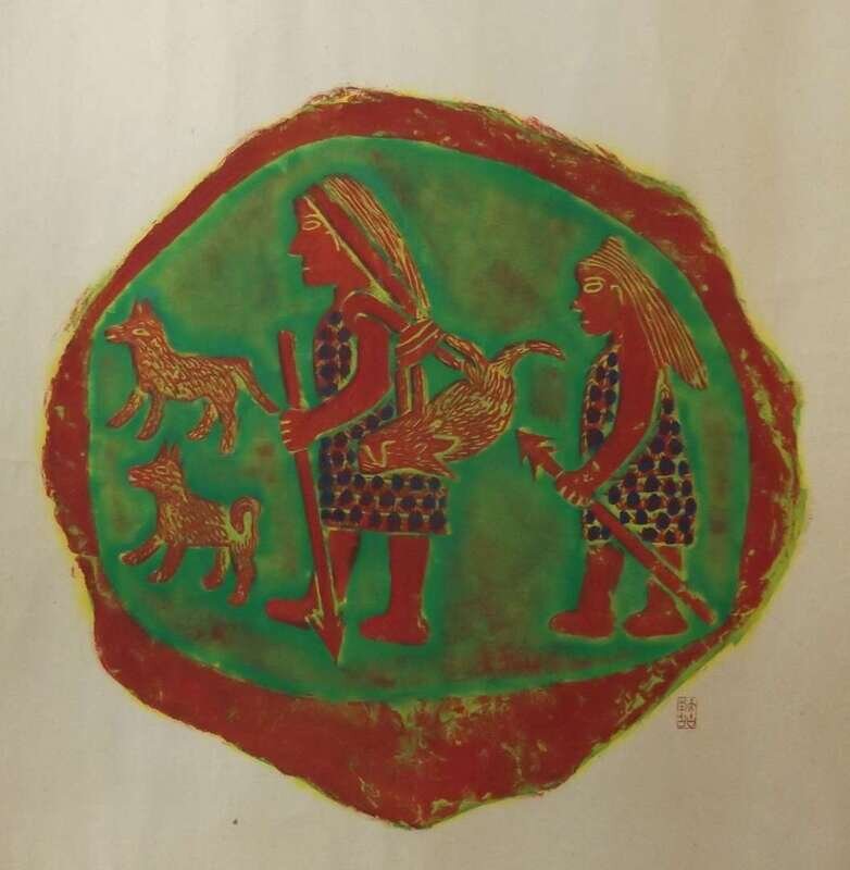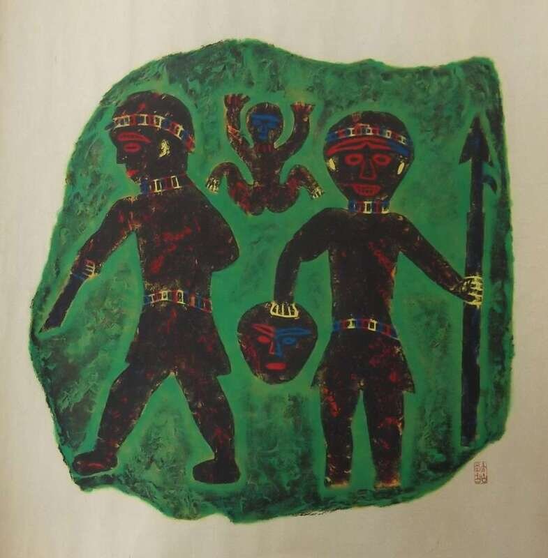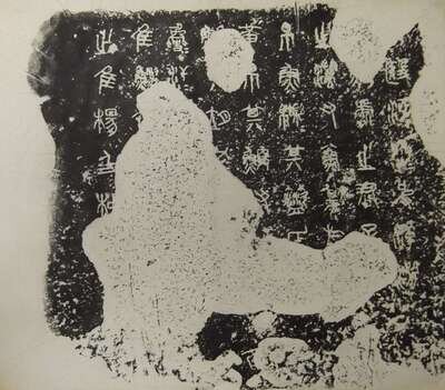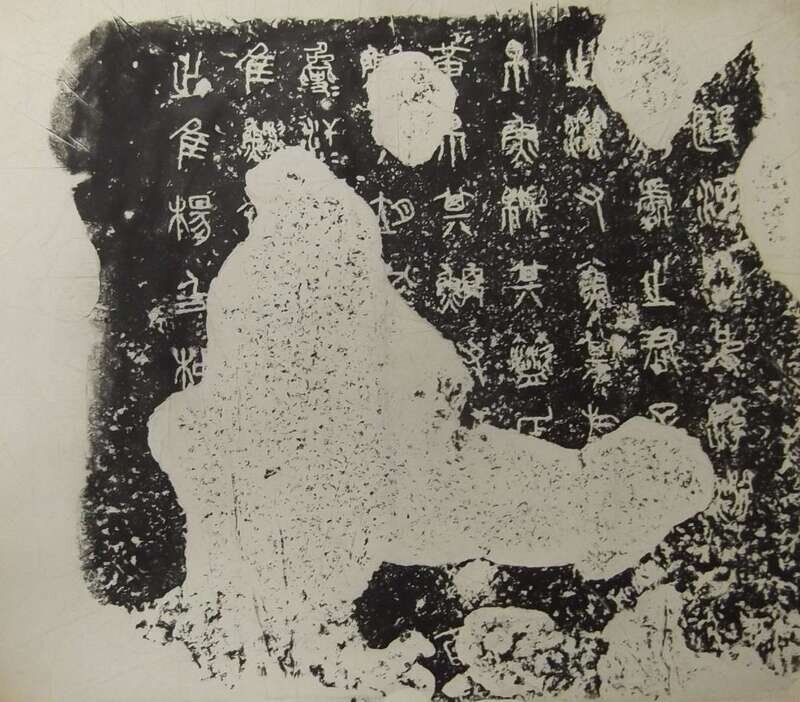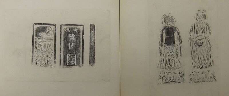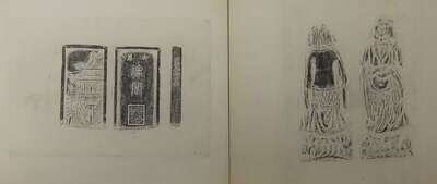 Including three rubbings of inkstone, cave drawing figure and stele largest 21 1/2 x 25 1/2 inches, two woodblock prints 23 1/2 x 23 1/2 inches (5).