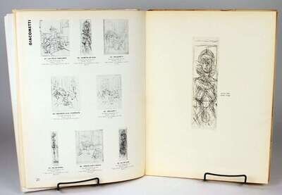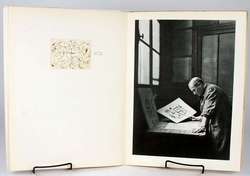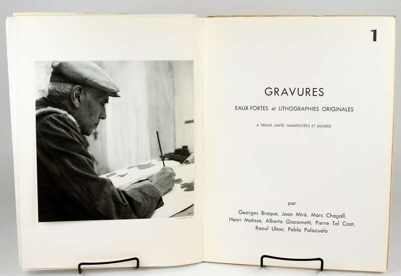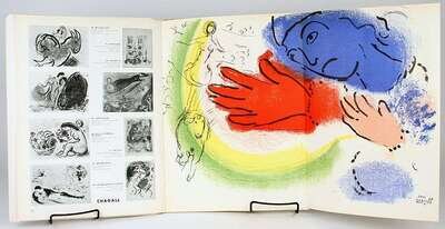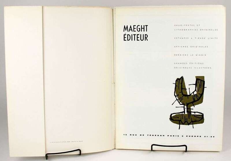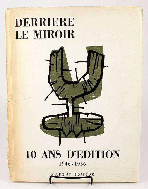 Derriere le Miroir. N° 92-93, 10 Ans d'Edition, 1946-1956. Paris: Maeght, 1956. Folio, orig stiff color litho wrappers over wrappers; bottom of spines chipped, spine darkening, some creasing, 2-inch horizontal fissure at center of front pictorial wrapper extending from spine, some edge wear, minor dampstaining at top edge of front color wrapper, other minor creasing. With orig double-page color lithos by Chagall & Miró, tinted litho by Bazaine, etchings by Miró & Giacometti. Minor internal creasing. Lithos & etchings attractive.