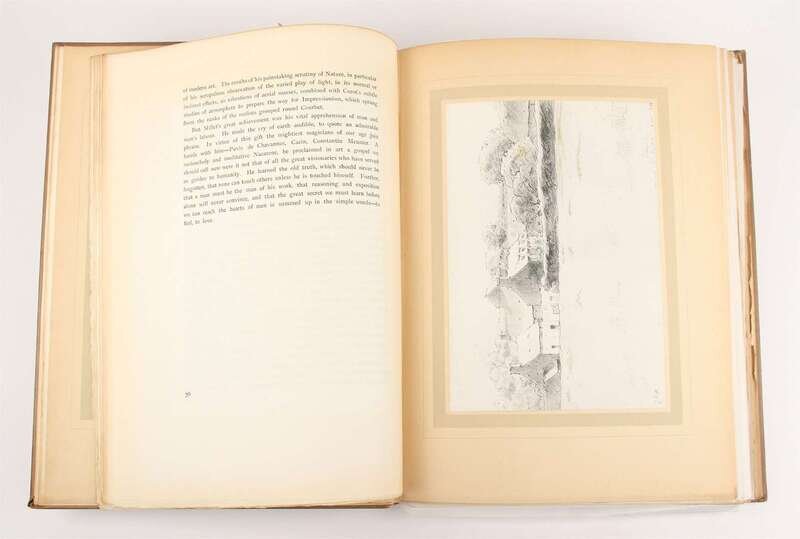 Millet, Jean Francois. The Drawings of. Philadelphia: J.B. Lippincott, 1906. #314/375. Intro essay by Leonce Benedite. Folio, orig green cloth, gilt, t.e.g., other edges rough trimmed; head of spine frayed & chipped, spine & extremities fading to brown. With 50 mtd plates. Internally clean. Bookplate of Charleton Noyes on paste-down.