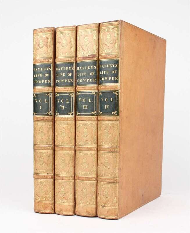 Cowper, William. The Life and Letters. London: J. Johnson, 1812. Tall 8vo, contemp full gilt-paneled polished calf, richly gilt foliate & floral spine compartments, dark green morocco spine labels; slightly scuffed. Frontis portrait. Front matter of vol 1 moderately foxed, otherwise internally clean & attractive. Period bdg.