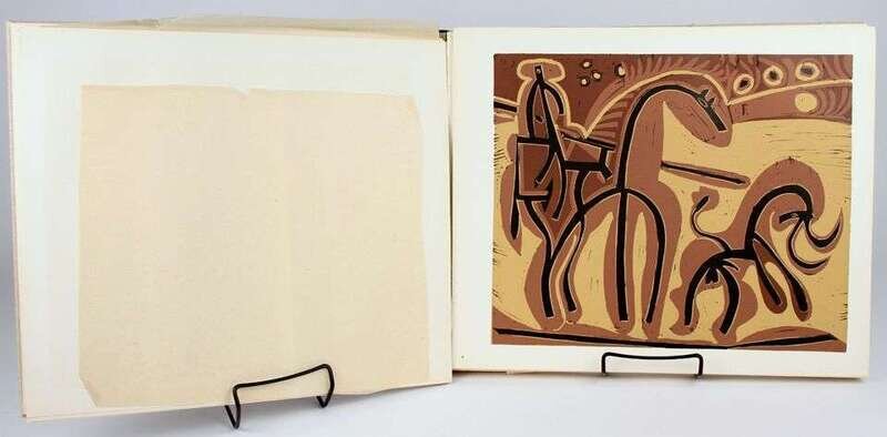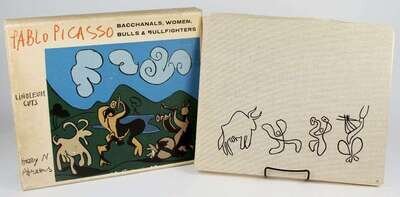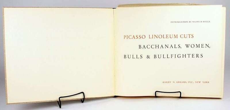 Picasso, Pablo. Linoleum Cuts: Bacchanal's Women, Bulls & Bullfighters. New York: Abrams. [1962]. Oblong folio, orig black-stamped pictorial gray cloth; light edge wear, slipcase (scuffed, some dust smudging). With 45 color plates. Joints stressed, a few leaves loose. Internally clean.