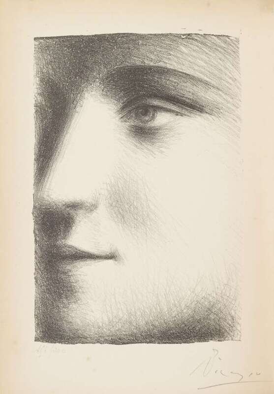 The original lithograph is numbered 156/200 & signed in pencil by Picasso; 120 of 200 of this litho served as the frontispiece of this monograph. Attractive example of the litho profile portrait of Picasso's mistress, Marie-Therese, and one of his first portraits of his muse. ["Visage de Marie-Therese"]; margins starting to tone, 3 small foxing spots below image at left.