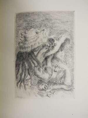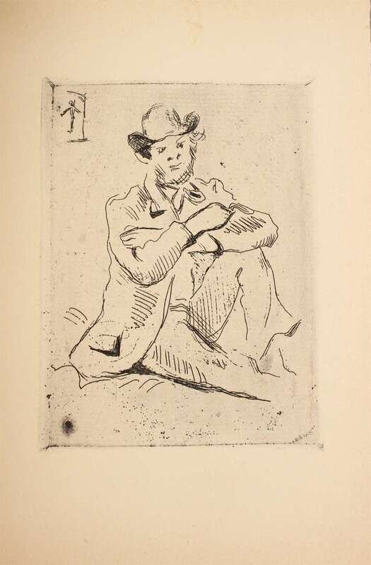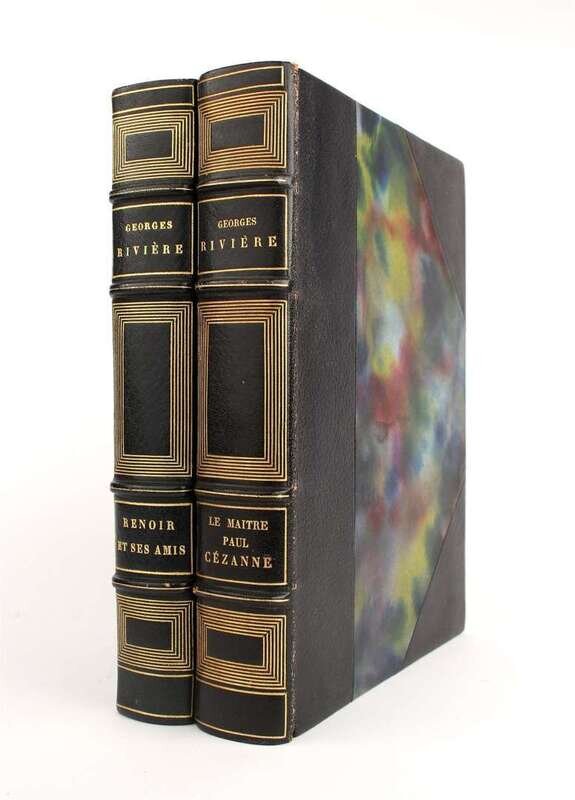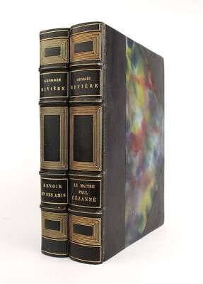Riviere, Georges. [Fine Art Monographs:] Renoir et ses amis. Paris: H. Floury, 1921. 1st ed, ordinary issue. 4to, color plates, other illus. * Le Maitre Paul Cezanne. Paris: H. Floury, 1923. 1st ed, #52/75 with proof, original etching & extra letters of front color wrapper. 4to, color plates, other illus. Both in uniform comtemp 3/4 dark blue crushed morocco, spines richly gilt, t.e.g., other edges rough trimmed, raised bands, original wrappers & spines bound in; joints often scuffed. Both internally clean.