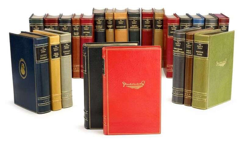 Dickens, Charles. [Works.] [London] Bloomsbury: Nonesuch Press, 1937-1938. #188/877. 8vo, contemp full gilt-paneled crushed levant morocco, raised bands, t.e.g., other edges untrimmed, all with black morocco spine labels on bdgs of various colors. Illus. Incl orig woodblock & a ptd pull from it in a morocco-bound case. Bright, attractive set.