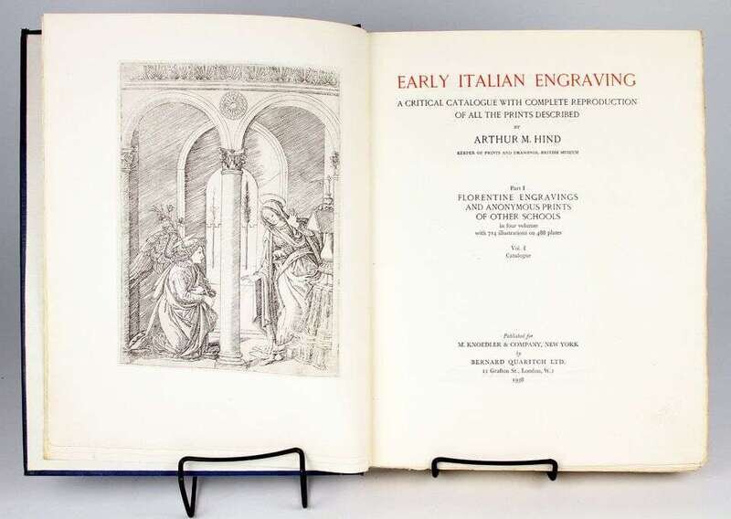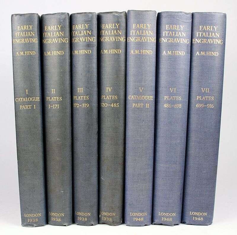 Hind, Arthur M. Early Italian Engraving: A Critical Catalogue ... London, 1938-1948. #4/375 (of 275), signed by A.M. Hind. Folio, orig blue cloth, gilt-lettered spines, t.e.g., other edges untrimmed; light wear, several vols a little cocked, spines often fading to green. With 916 plates. Internally clean.