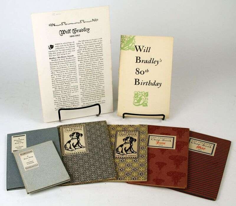 (Bradley, Will, designer, etc.) Lamb, Charles. A Dissertation upon Roast Pig. [Concord MA: Sign of the Vine, 1902.] 12mo, orig blue bds, paper spine label. Unopened, near fine. * Withers, George. Love Song. [Concord MA: Sign of the Vine, 1903.] 24mo, orig state bds, paper label; minor edge wear. Unopened. * The American Chap-Book. N.p.: American Type Founders Co, Jan, 1905. 12mo, orig bds, paper label; light to moderate edge wear. * The issue in wrappers of the preceding; light wear. * The May 1905 issue in bds of the preceding. Paper label; light wear. * The June 1905 issue of the preceding. Orig bds, paper label; light wear. * The Typophiles. Collective Birthday Greetings … N.p., [1948]. 12mo, orig sewn wrappers. Portrait. Unopened. * (Offprint) Will Bradley & His Legacy to the Graphic Arts. [New York, 1965.] 8vo, orig self wrappers. * "Memories, 1875-1895." Pasadena: Typofiles, 1949. 8vo, orig wrappers. Portrait. Near fine. * Will Bradley, His Work: An Exhibition. San Marino: Huntington Library, 1951. 8vo, orig wrappers. Frontis, illus. Near fine.