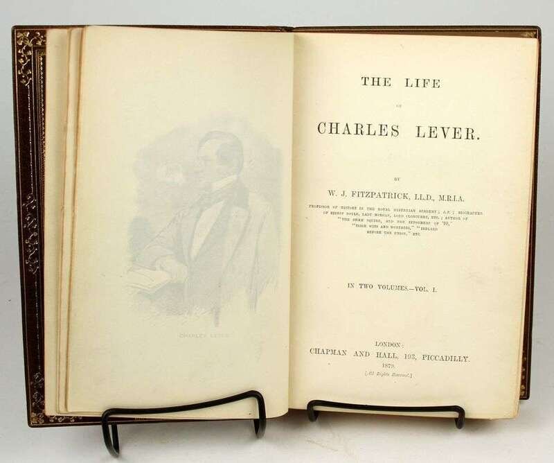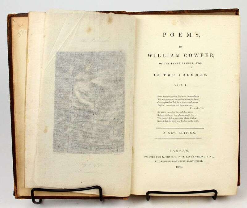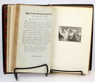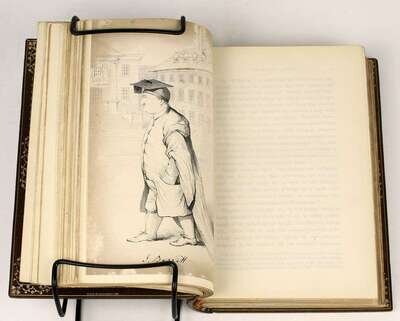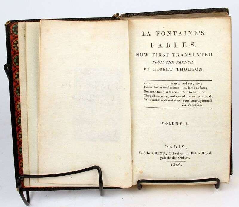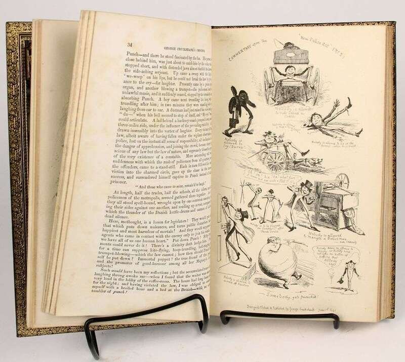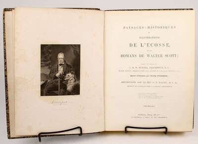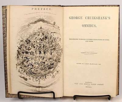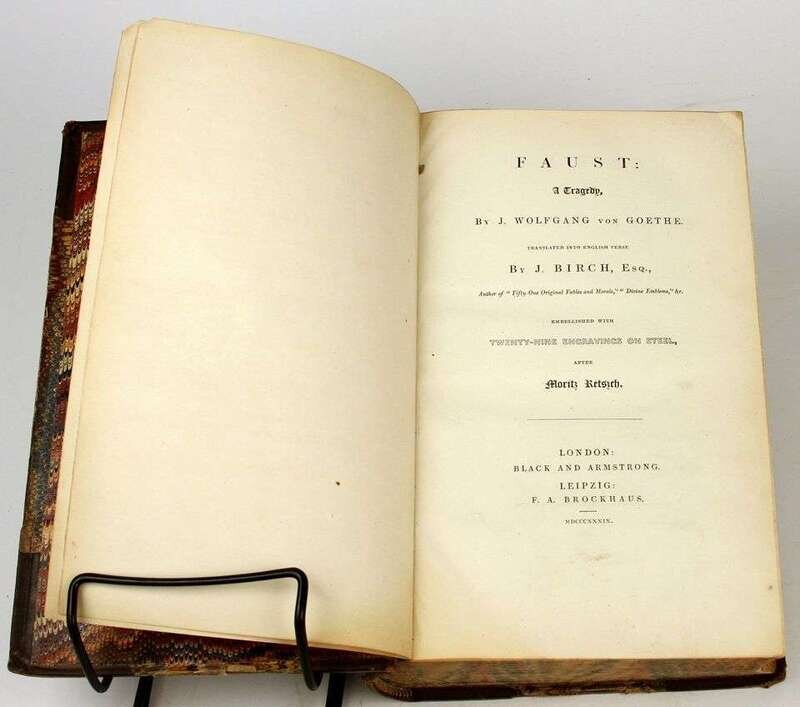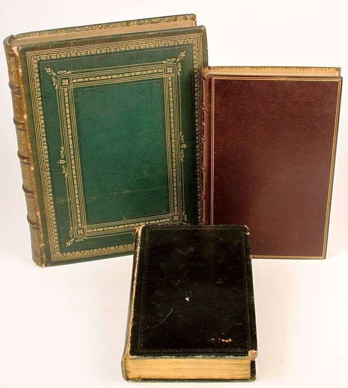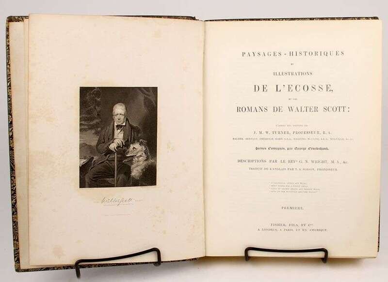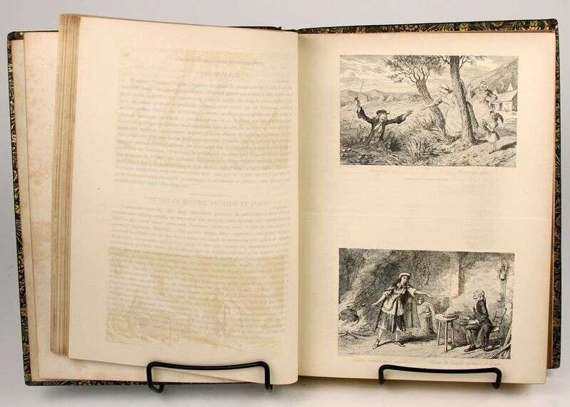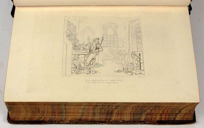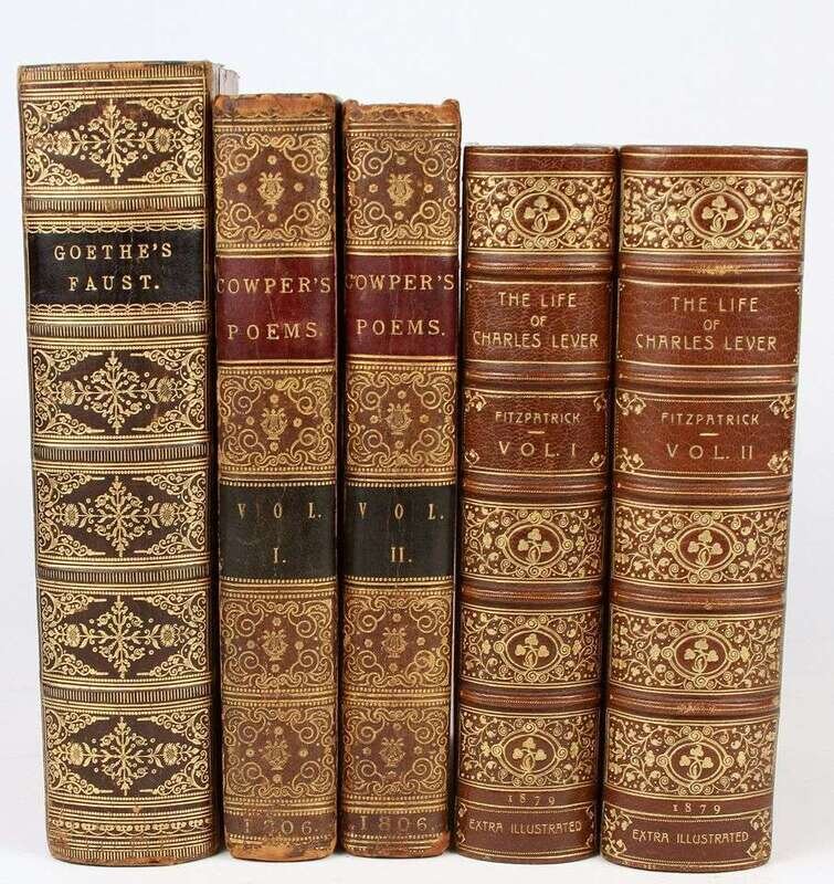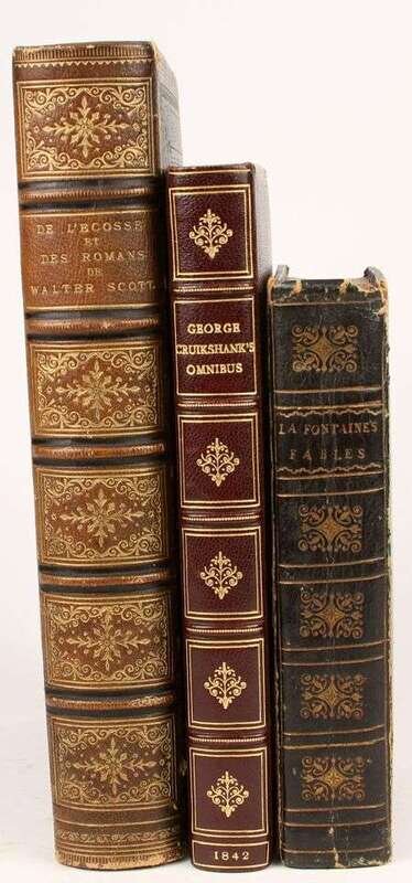 Illustrated Books - 19th-Century Imprints: La Fontaine, Jean de. Fables. Paris: Chenu, 1906. Translated by Robert Thomson. 4 vols in 1. 8vo, contemp dark blue straight-grained morocco; scuffed, joints & corners rubbed, portrait, 14 engraved plates, light to moderate foxing. * (Fuseli, Henry, illustrator). Cowper, William. Poems. London, 1806. 2 vols. 8vo, comtemp tree calf, spines gilt, morocco spine labels; scuffed, joints rubbed & tender. With 8 plates after Fuseli. Light foxing to front matter. Tall set. * (Retzch, Moritz, illustrator). Goethe, J.W. von. Faust. London: Leipzig, 1839. Translated by J. Birch. 2 vols in 1. 4to, original 1/2 calf & marbled bds & edges, spine gilt; scuffed, extremities rubbed. With 40 engraved plates. Errata, list of subscribers. Internally clean. * (Turner, J.M.W.; Cruikshank, George, et al., illustrators). Wright, George N. Paysages Historiques et Illustrations de l'Ecosse, et des Romans de Walter Scott. London; Paris, etc: Fisher, [1836-1838]. 4to, contemp full richly gilt green morocco, a.e.g., gilt floral turn-ins; spine faded to brown, joints & corners scuffed. With portrait & 107 plates on 95 sheets. Scattered light foxing. * George Cruishank's Omnibus. London: Title & Boque, 1842. 1st book form ed. 8vo, later 19th-century full gilt paneled dark brown morocco, spine gilt, turn-ins gilt, t.e.g., other edges untrimmed, by Riviere & Sons; minor wear. With 22 steel-engraved plates, 78 wood-engraved illus. Internally clean. Cohn 190. * Fitzpatrick, W.J. The Life of Charles Lever. London: Chapman and Hall, 1879. 2 vols. Lg 8vo, contemp full crushed green morocco, gilt, richly gilt floral spine compartments, t.e.g., other edges untrimmed, turn-ins gilt, raised bands, silked endpapers, by Zaehnsdorf; spine faded to brown, corners scuffed. Plates, extra-illustrated with approx 20 engraved & litho portraits.