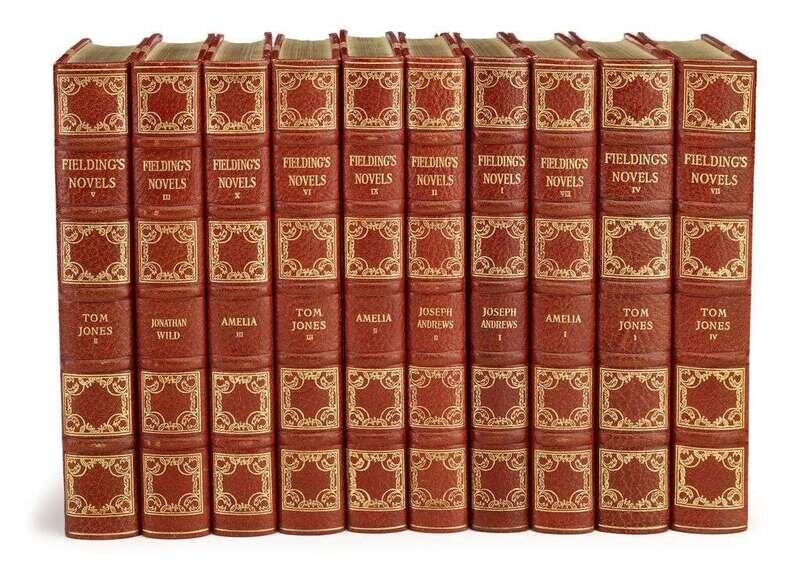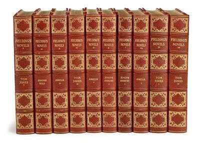 Fielding, Henry. The Novels. Boston: Houghton Mifflin, 1926. #61/520, printed by Shakespeare Head Press. 8vo, contemp 3/4 crushed burgundy niger morocco, gilt, gilt-lettered & decorated spine compartments, t.e.g., other edges untrimmed, raised bands, by the Riverside Press; very occasionally, very slightly scuffed. Plates. Mostly unopened. Bright, attractive bdg.