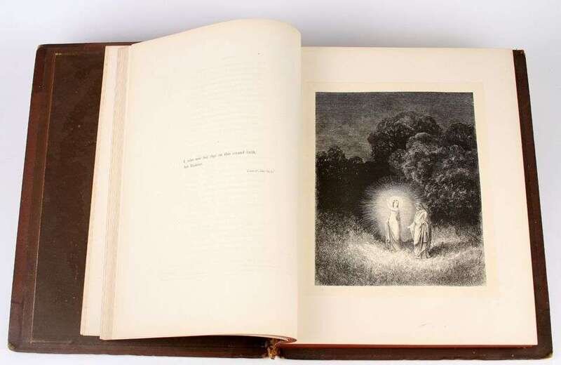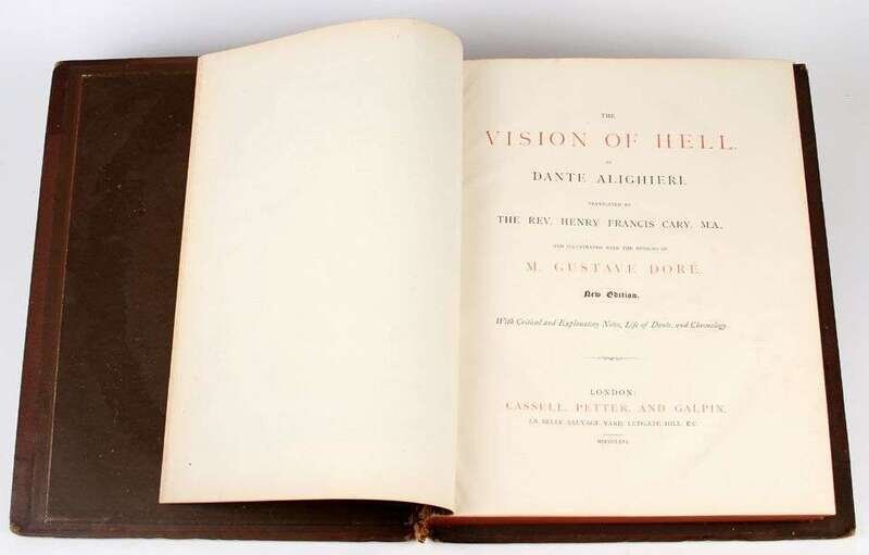 (Dore, Gustave, illus.) Dante Alighieri. The Vision of Hell. London: Cassell, Petter and Galpin, 1866. Lg 4to, contemp 1/2 brown morocco & pebbled cloth; front cover detached. With frontis portrait + 75 wood-engraved plates, lettered guard sheets. Title a little wrinkled, but internally clean & crisp.
