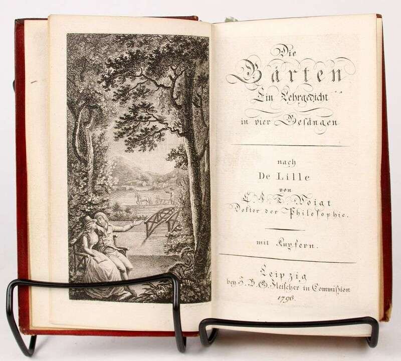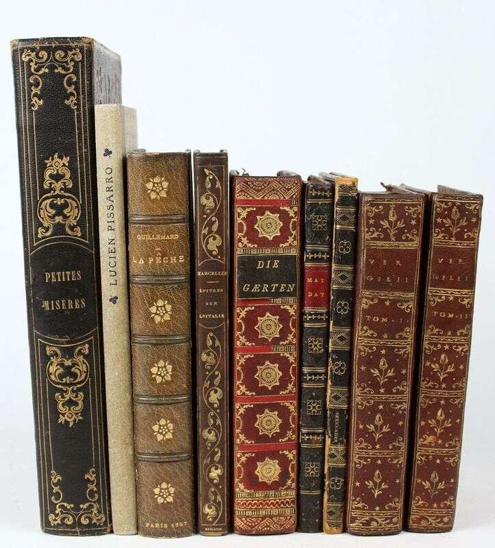 Illustrated & Fine Printing - Continental & English, 18th- & 19th-Century: (Vergilius Maro, pub.) Opera. Paris: Coustelier, 1745. 2 vols. 12mo, full contemp burgandy morocco, gilt, spines richly gilt, turn-ins gilt, a.e.g.; slightly scuffed, corners bumped. With 12 engraved plates. Printer's mark in imitation of Stephanus. Minor internal spotting. * Voigt, C[hristian] F[rederick] T[raugott]. Die Garten: ein Lehrgedicht in vier Gesangen. Leipzig: Fleischer, 1796. 12mo, contemp gilt-paneled scarlet morocco, spines richly gilt, green morocco label; extremities rubbed. With engraved frontis, plate engraving at end of text. Scattered light foxing. * Bloomfield, Robert. May Day With The Muses. London: 1822. 1st ed. 12mo, contemp 1/4 calf & marbled bds, red morocco spine label; scuffed, joints rubbed. Wood-engraved. Scattered light foxing. * (John Moir, printer.) Serenades, Songs, and Other Poems. Edinburgh, 1822. Sm 8vo, contemp richly gilt black morocco, a.e.g; joints & extremitites rubbed. Internally clean & crisp. * Maccellier Marie-Loui-Auguste Demartin du Tyrac, Comte de. Epitres et veis sur l'Italie. Paris: Adrian le Claire, 1835. 12mo, full contmp olive calf, gilt; scuffed, joints rubbed. Scattered light foxing. With Maggs Bros. label on front free endpaper, "De la bibliotheque de Comte de Chambord..." * Grandville, Petites. Miseres de la view humaine. Paris: H. Fournier, 1843. 8vo, orig pub full black morocco, gilt, a.e.g.; joints & extremities rubbed. Full-page & wood-engraved text illus. Light to occasionally moderate foxing. * Guillemard, N. La Peche. Paris: Hachette, 1857. 12mo, contemp 3/4 green morocco; scuffed, joints rubbed, orig cover bound in. Wood-engraved illus by L. Royer. * Pissarro, Lucien. Notes on The Eragny Press, and A Letter to J.B. Manson. Cambridge, 1957. 1/500. 12mo, orig gray-backed floral bds; light wear. Color plates & other illus.