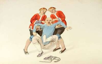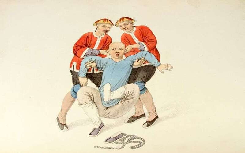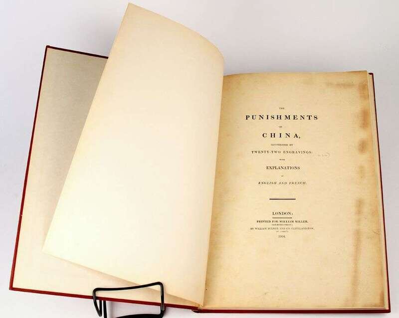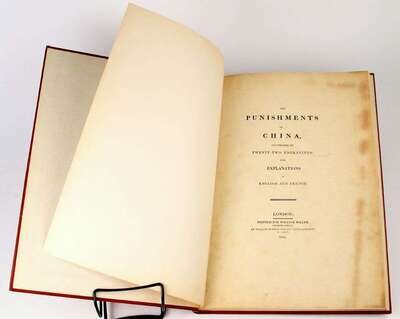 [Mason, George Henry.] The Punishments of China. London: for William Blumer, 1804. Folio, modern buckram. With 22 hand-colored plates. English & French titles & text. Some darkening & smudging to titles, offsetting from plates. Plates generally clean & crisp.
