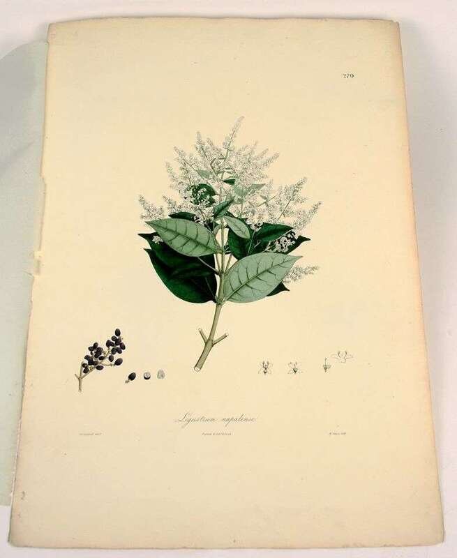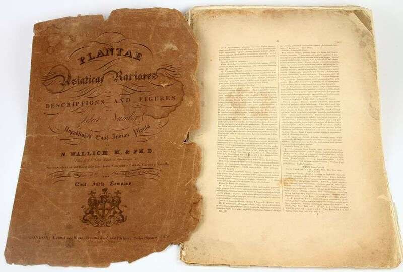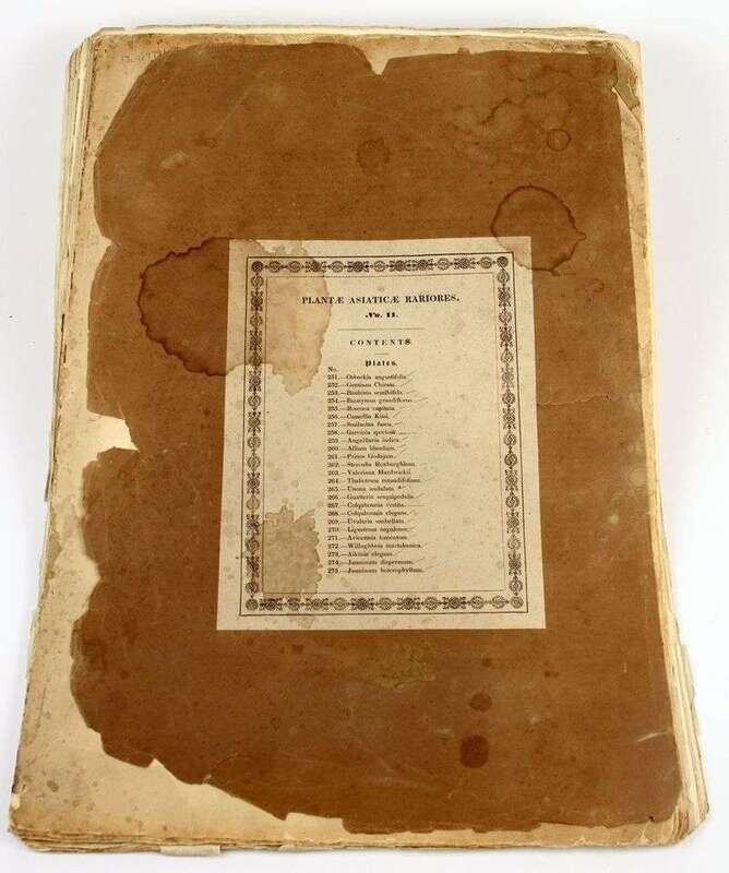 (Botanical Plates.) Wallich, Nathaniel. Plantae Asiaticae Rariores ... London, 1830-1832. 22 folio hand-colored litho plates from part 11, with front wrapper for Part 11. Plates 251-257, 259-266, 268-275. Most plates clean, a few with edge wear or dust smudged edges. Sold with all faults as a collection of plates.