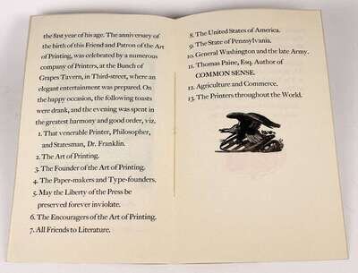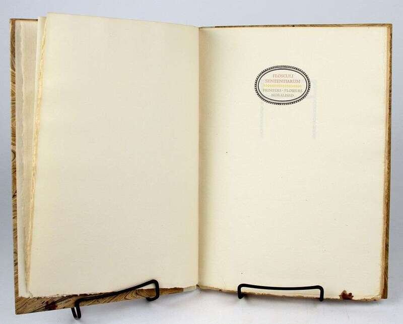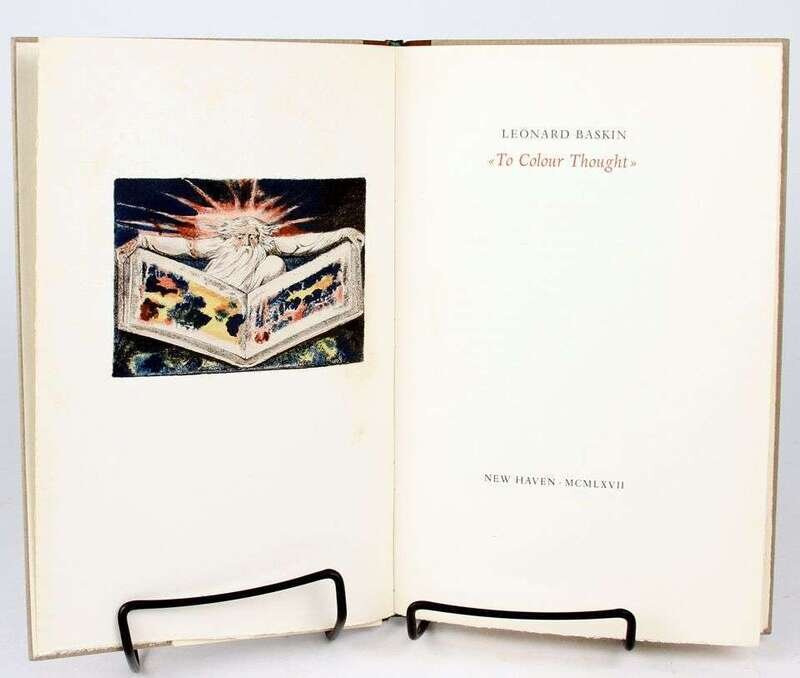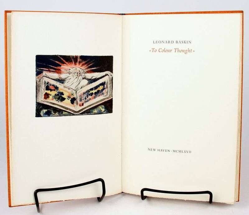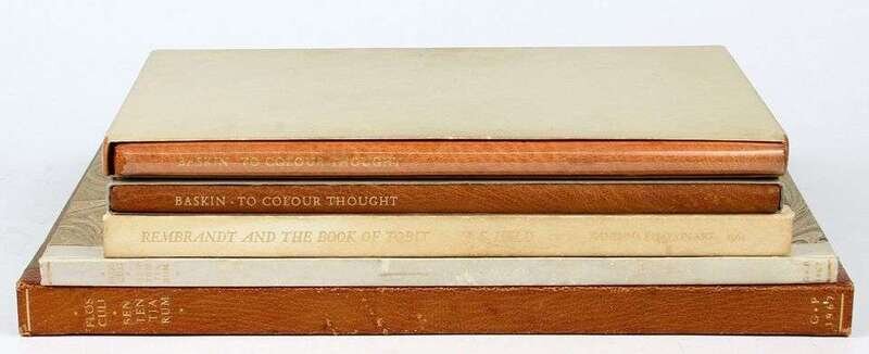 (Leonard Baskin & The Gehenna Press): Baskin, Leonard. To Colour Thought. New Haven, 1967. #9/10. 8vo, orig full orange niger morocco, gilt-lettered spine, t.e.g., slipcase. Color frontis, plates. 1/10 bound for Yale University Library. Near fine, slightly edge-worn slipcase. * Another copy of the preceding title. #299/300. Morocco-backed bds, gilt-lettered spine, t.e.g., slipcase. Presentation copy signed by Leonard Baskin, et al. on front free endpaper recto. Near fine. * Flosculi Sententiarum. Northampton, 1967. #13/50 (of 300), signed by Leonard Baskin. 4to, orig full crushed mustard levant morocco, gilt; minor wear. Orig morocco-backed cloth fall-down box; spine of box occasionally rubbed. * Another copy of the preceding title. #95/250 (of 300). 4to, orig vellum-backed marbled bds; minor wear. Presentation copy, signed & inscr at foot of limitation page by Leonard Baskin. * Held, Julius S. Rembrandt and The Book of Tobit. Northampton, 1964. 1/1000, out-of-series copy. 4to, orig cloth; slightly scuffed. Plates. * The Encouragers of The Art of Printing. Northampton, 1966. Folio, orig stiff wrappers. Near fine. 3 copies.