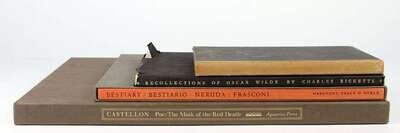 Private Press Books: (Riverside Press.) Thoreau, Henry D. Walking. [Cambridge], 1914. 1st separate ed, #118/550. Tall 12mo, orig cloth-backed bds, edges untrimmed; occasionally a little scuffed. Internally clean. BAL 20228. * (Nonesuch Press.) Raymond, Jean Paul; Ricketts, Charles. Oscar Wilde. Bloomsbury, 1932. 1/800, reviewed copy. 8vo, orig pictorial cream cloth, t.e.g., edges rough cut; minor wear, d/j (some chipping at edges), some discoloration to endpapers. * (Spiral Press.) (Frasconi, Antonio, illus.) Neruda, Pablo. Bestiary/Bestiario. New York, 1965. #169/300, signed by Antonio Frasconi & Joseph Bloomfield, printer. 4to, orig red cloth-backed, red- & black-stamped white pictorial bds; light wear, slipcase (minor wear). With hinge mtd color woodcut frontis signed by Fransconi. Attractive copy. * (Aquarius Press.) (Castellon, Federico, illus.) Poe, Edgar A. The Mask of the Red Death. Baltimore, 1969. #443/500 (of 535), signed by Castellon. Folio, orig two-tone cloth, slipcase. With 16 orig lithos. Near fine.