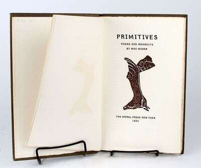 (Spiral Press.) Weber, Max. Primitives: Poems and Woodcuts. New York, 1926. #44/350. Tall 8vo, black-decorated gray bds; scattered light scuffing & a few small blisters at bottom of front joint, minor edge wear. Woodcut illus, the last signed by Max Weber. Internally clean & crisp. Subscription form. "Max Weber," a monograph by Holger Cahill.