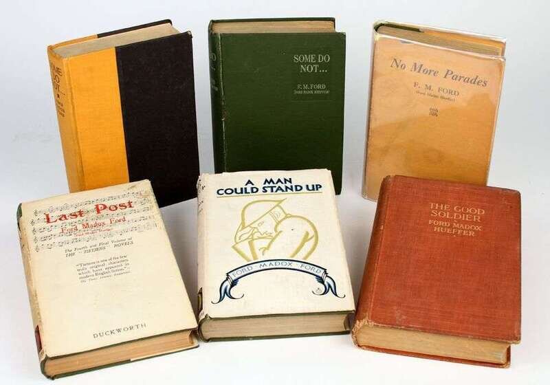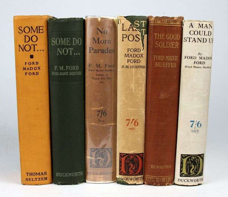 Ford, Ford Madox: The Good Soldier. New York: John Lane, 1915. 1st ed, American issue. 8vo, orig white-lettered brick-red cloth; spine ends & corners frayed, moderately scuffed, some edge wear. Top edge stained red. With 16pp pub cat at back. Some light smudging to endpapers, occasional internal spotting, some foxing to advts. Harvey A46a. * ["Tietjen's" Novels:] Some Do Not … London: Duckworth, [1924]. 1st ed. 8vo, orig white-lettered green cloth; light edge wear. * The 1st American ed of the preceding. Orig orange cloth & black bds; moderate edge wear, slightly dusty. H. A56a&b. * No More Parades. London: Duckworth, [1925]. 1st ed. 8vo, orig green cloth, gilt-lettered spine; light wear, d/j (minor chipping to edges). Slight discoloration to endpapers. HA59a. * A Man Could Stand Up. London: Duckworth, [1926]. 1st ed. 8vo, orig green cloth, gilt-lettered spine; light wear, d/j (minor chipping to edges, slightly dusty). H. A60a. * The Last Post. London: Duckworth, 1928. 1st English ed. 8vo, orig green cloth, gilt-lettered spine; light wear, d/j (loss of lettering at head of spine panel, some spotting.) Advts. H. A65c. All complete.