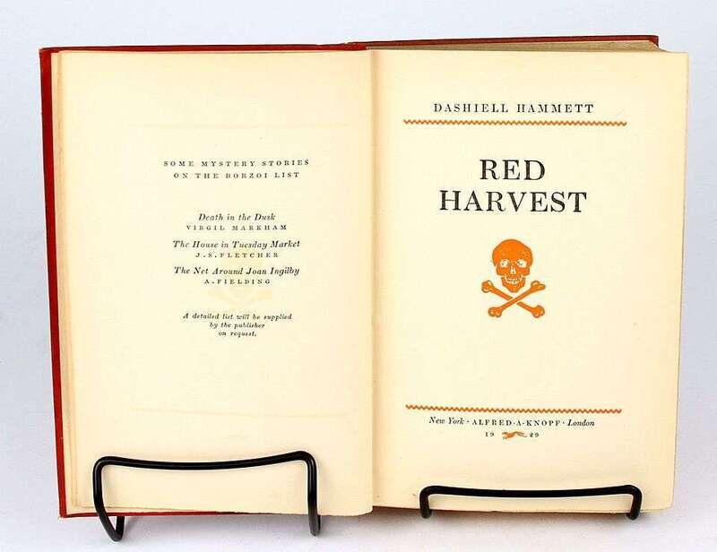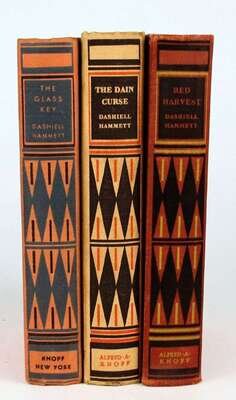 Hammett, Dashiell. Red Harvest. New York; London: Knopf, 1929. 1st ed, 1ptg. 12mo, orig yellow-stamped pictorial cloth; moderately scuffed, some edge wear, slightly dusty, a little cocked. Layman A1.1a. * The Dain Curse. New York; London: Knopf, 1929. 1st ed, 1st ptg. 12mo, orig red-stamped pictorial yellow cloth, top edge stained dark brown, other edges untrimmed; occasional edge wear, slightly dusty, a little cocked. Endpapers dusty, some foxing. With "dopped" for "dropped," line 19, p260. L. A2.1a. * The Glass Key. New York; London: Knopf, 1931. 1st ed, 2nd ptg. 12mo, orig pictorial orange cloth; light to moderate wear, a little dusty. L. A4.2a.