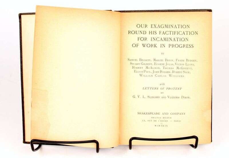 [Joyce, James; Beckett, Samuel, et al.] Our Examination Round His Factification for Incarnation of Work in Progress. Paris: #8 Shakespeare and Company, 1929. 1st ed, #18/96, on verge d'Arches. 12mo, orig pebbled black cloth; scuffed, spine ends & corners rubbed. Internally moderately toned, repairs at fore-edges of half-title, title-page, contents leaf & pp3-4.