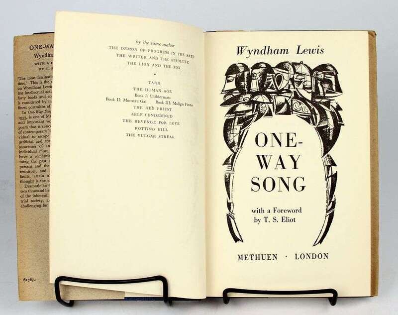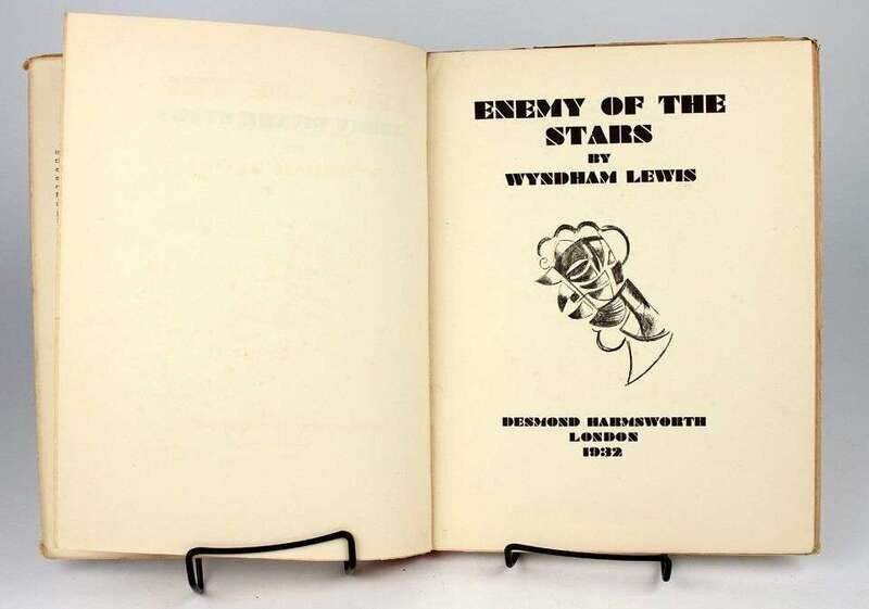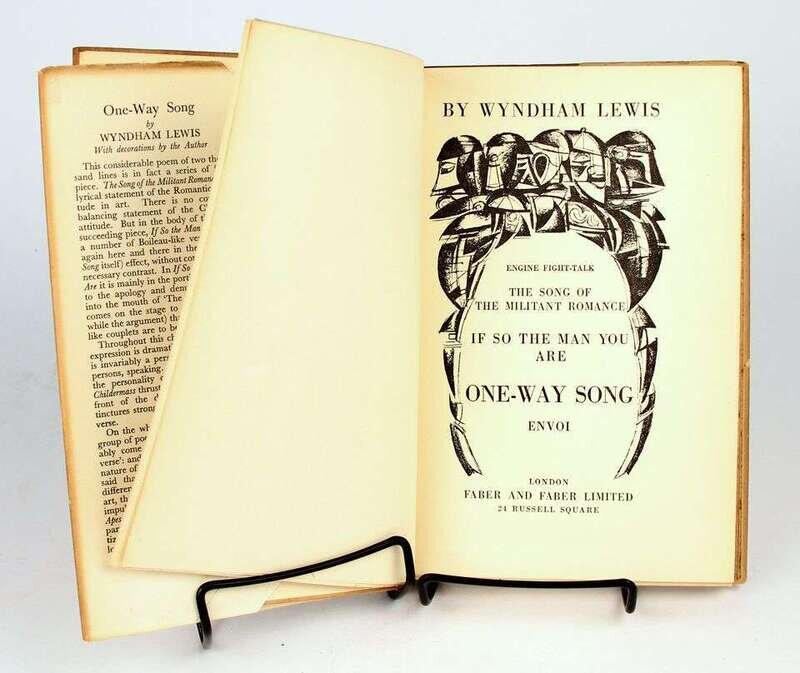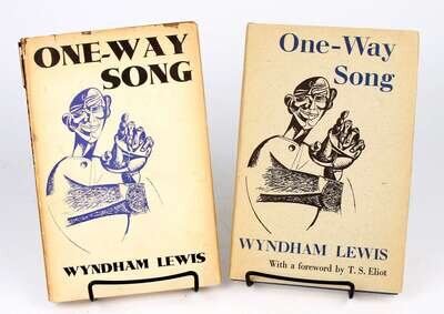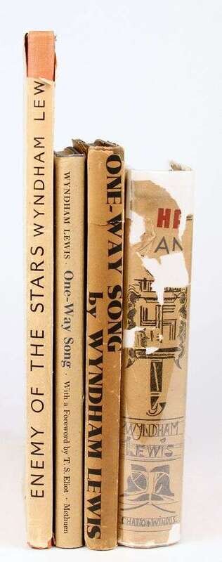 Lewis, Wyndham: Hitler. London: Chatto & Windus, 1931. 1st ed. 8vo, orig red- & black-lettered tan cloth interlaced with orange threads, top edge stained yellow; light wear, d/j (top half & foot of spine panel chipped & defective). Photo frontis port of Hitler + 7 plates. Bookplate of Mongomery Evans II on front paste-down, former owner's pencil annotation on back paste-down. Sound, clean copy. Morrow & Lafourcade A13. * The Enemy of the Stars. London: Desmond Harmsworth, 1932. 1st ed, 1st state. 4to, orig pictorial bds; light to moderate wear, d/j (chipped along edges, some dust soiling & spotting. Illus. M&L A17. * One-Way Song. London: Faber, [1933]. 1st trade ed. 8vo, orig blue-lettered brown cloth; some darkening & dust soiling, d/j (chipping at edges & spine panel, somewhat dusty. Illus. M&L A21b. * The 1960 ed of the preceding with foreword by T.S. Eliot, 1st ptg. 8vo, orig cloth, d/j; minor wear. Gallup B82.