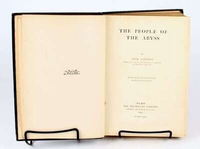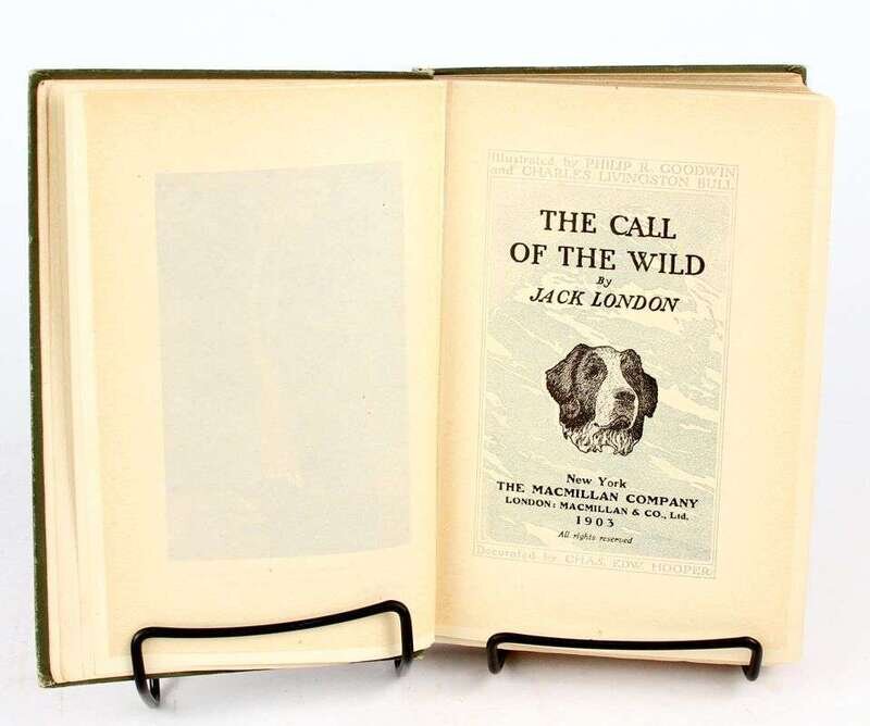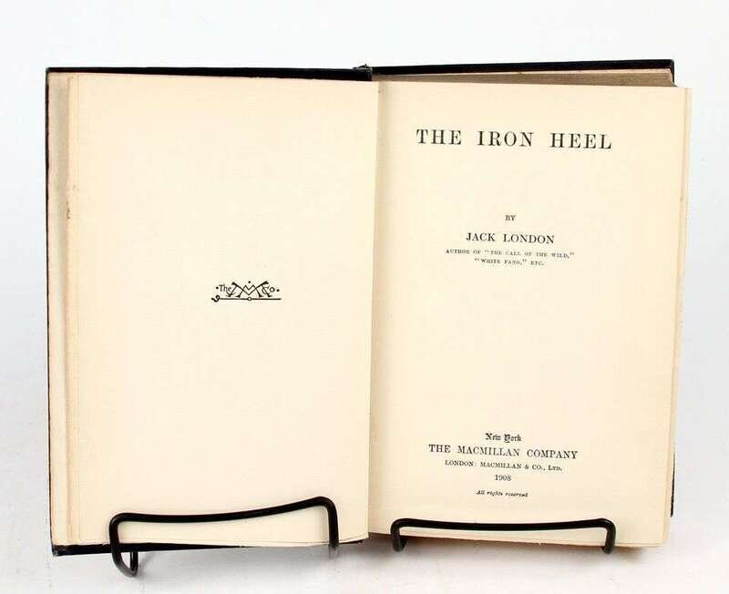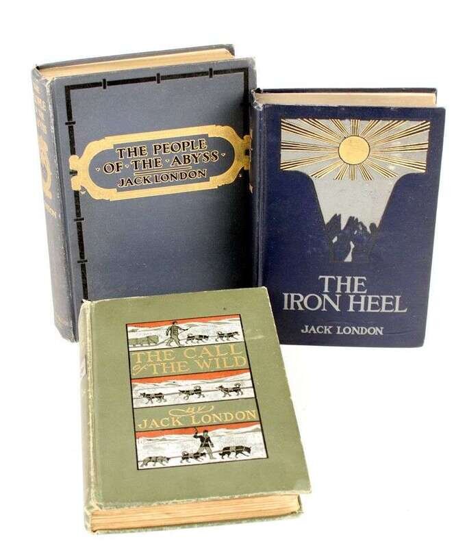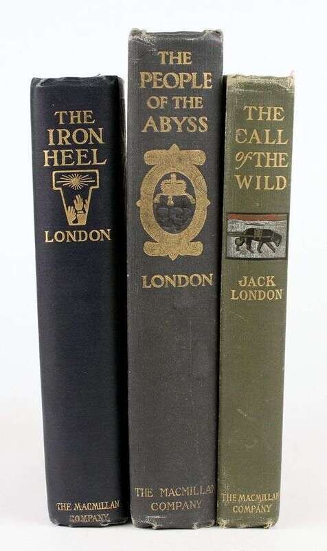 London, Jack: The Call of the Wild. New York: Macmillan, 1903. 1st ed, 1st ptg. 12mo, orig gilt-lettered color pictorial green cloth, t.e.g., other edges untrimmed; slightly scuffed, joints, spine ends & edges rubbed, spine ends starting to fray. Frontis, 10 full-page illus, 2pp advts at back. BAL 11876. * The People of the Abyss. New York: Macmillan, 1903. 1st ed. 8vo, orig gray-blue cloth, gilt, t.e.g., other edges untrimmed; back cover scuffed, slightly cocked. Photo illus, frontis, 9 plates, 9 full-page text illus, 3pp advts. Frontis loose. Former owner's ink stamp on front paste-down. BAL 11877. * The Iron Heel. New York: Macmillan, 1908. 1st ed. 12mo, orig white-lettered gilt pictorial two-tone blue cloth, t.e.g., other edges untrimmed. 4pp advts. Tight, bright copy.