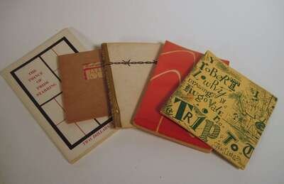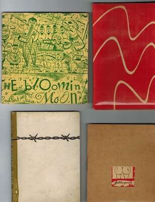 Lowry, Robert: Trip to the Bloomin' Moon. [Cincinnati: Little Man Press], [1939]. 1st ed. Sq 16mo, orig pictorial wrappers; light edge wear, small smudge to back wrapper. Illus by Hugo Valerio. Lowry's 1st separate pub. * The Blaze Beyond the Town. [Bari, Italy]: Piccolo, 1945. #191/300 signed by Robert Lowry. 24mo, orig. stiff wrappers - barbed wire design; slightly dusty. Some internal dampstaining. * Feel They Poems. [Bari, Italy], [1945]. #7/125 by Robert Lowry. 16mo, orig stiff stamped wrappers. Light wear. * The Journey Out, 3 Stories. Bari, Italy, 1945. #44/350 signed by Robert Lowry. 24mo, orig white decorated stiff wrappers; light wear. Internally slightly toned. * The Prince of Pride Starring. [Cincinnati]: National Genius Books, [1959]. #167/1000, signed by Robert Lowry. 12mo, orig black- & red-decorated white wrappers; light wear, slightly dusty. Limitation page a little damp wrinkled.