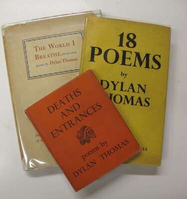 Thomas, Dylan: 18 Poems. London: Fortune, 1934 [but ca 1942]. Tall 8vo, orig red cloth; light wear, d/j (slightly dusty, price clipped). 3rd issue, mixed state. Knole Park imprint, text on pp12 & 23 corrected. Rolph B3. * The World I Breathe. Norfolk: New Directions, 1939. 1st ed, 1st issue. Tall, 8vo, orig brick red cloth, gilt-lettered spine; light wear, spine ends slightly dusty, d/j (some chipping to spine panel, head of foot chipped away, other chipping at corners, scattered spotting & occasional dust soiling). Internally clean. R. B5. * Deaths and Entrances. L: Dent, [1946]. 1st ed. 16mo, orig orange cloth, gilt-lettered spine; light wear, edges a little dusty, d/j (slightly dusty, light edge wear). R. B10.
